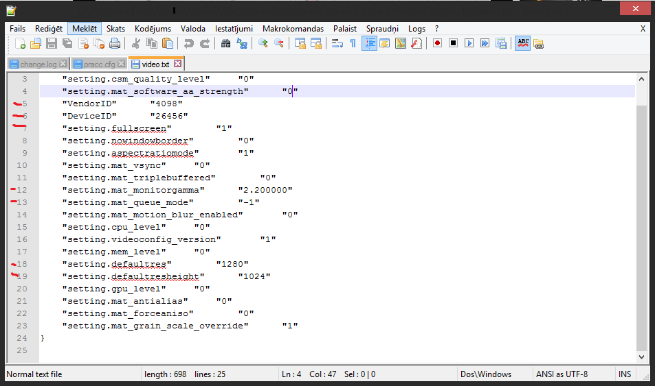 Vēl piemetīšu bildi no video.cfg faila, caur kuru var samazināt vēl vairāk patārētos datora resursus kā caur In-game optioniem.