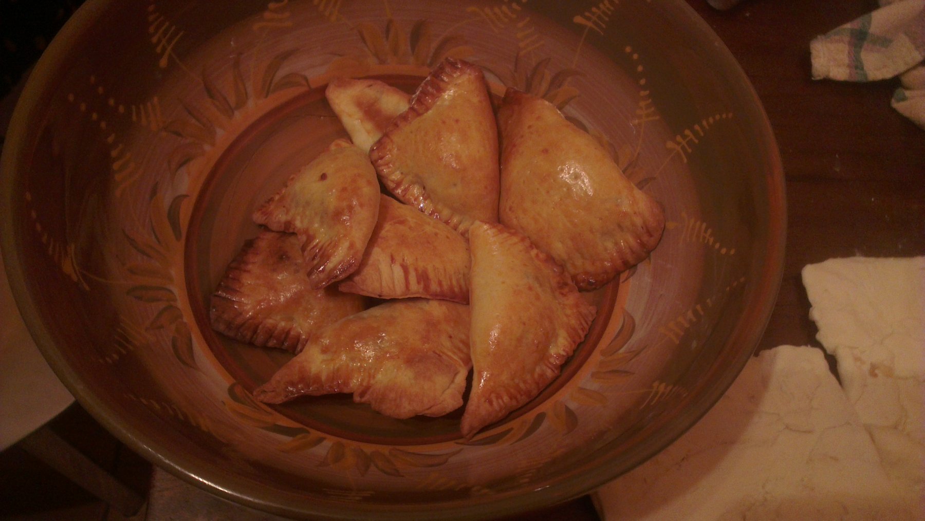 Kvadrāta vidū liek gaļas masu un kvadrātu pārloka diagonāli par trijstūri. Maliņas nospiež ar dakšiņu lai būtu glītāk.