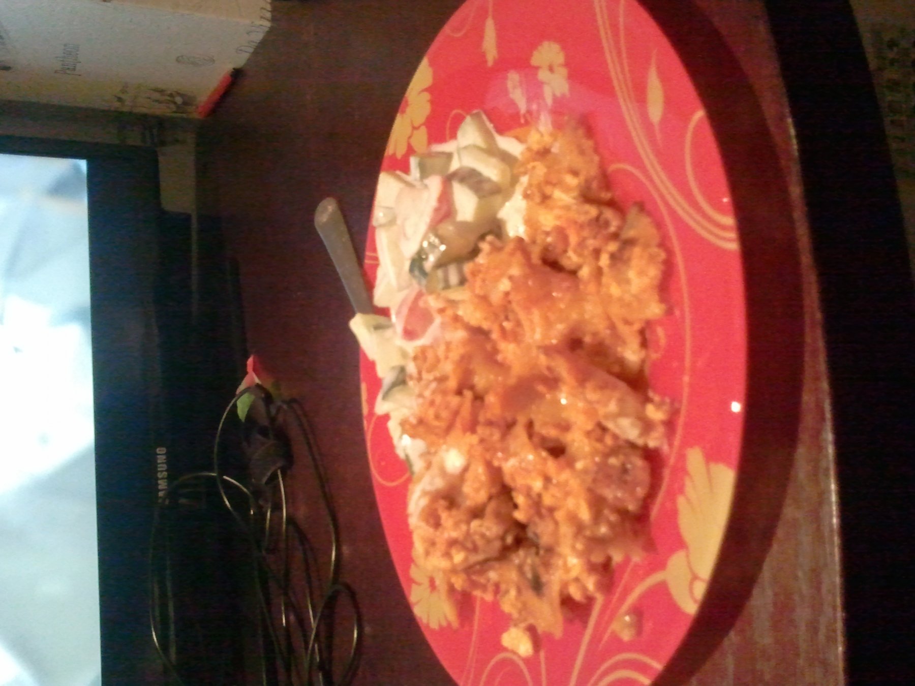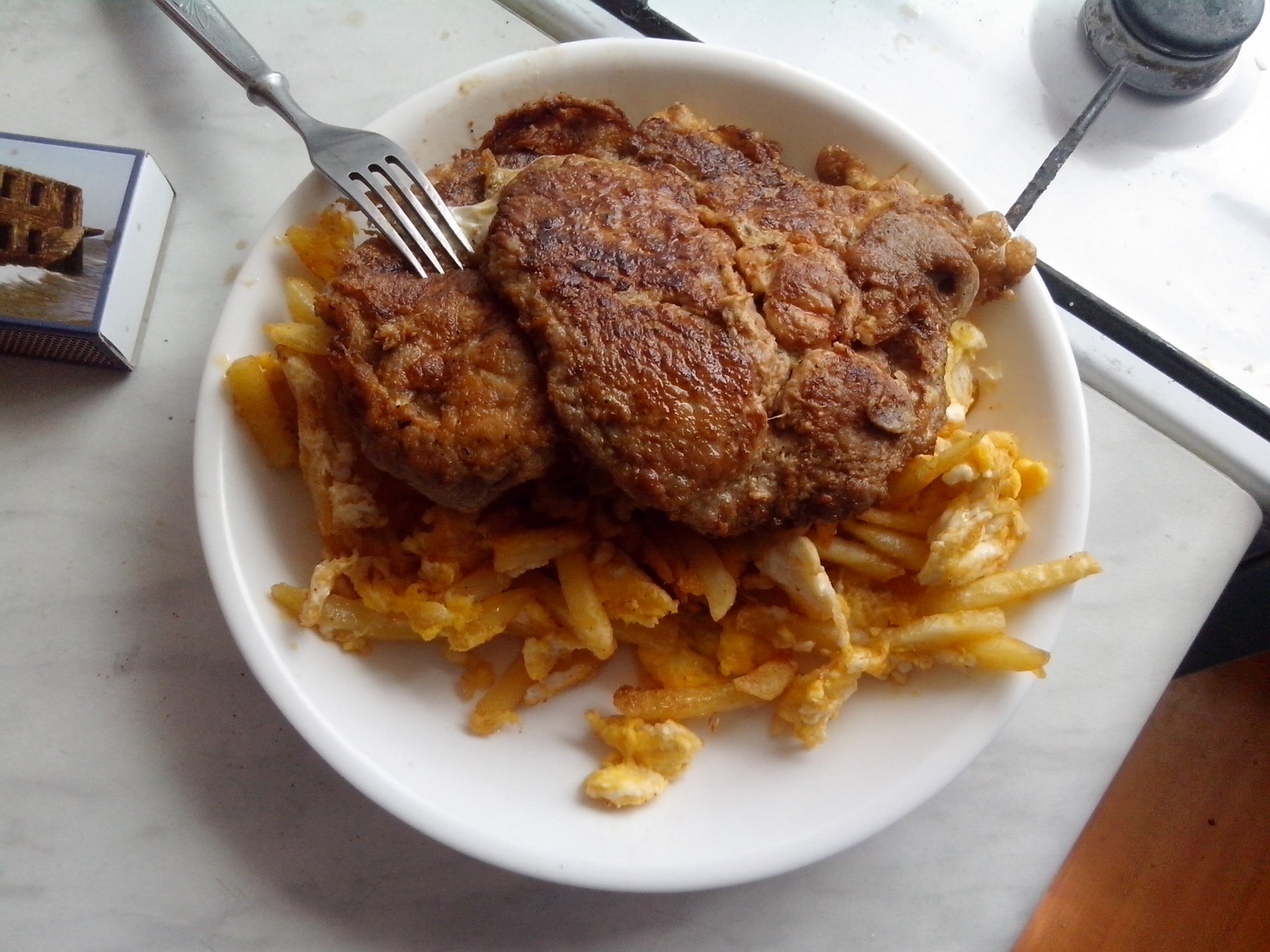Cepti kartupeļi ar sīpoliem, klāt vēl cepta kārtainā gaļa + dilles pārkaisītas pāri visam. Kaut, kas labāks nekā vakardienas sviestmaize.