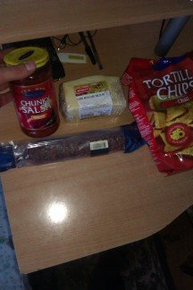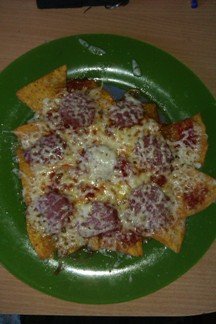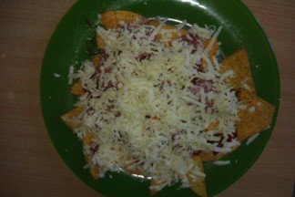 Pamatā meksikāņu čipsi, tad salsas mērcīte, nedaudz žāvētas desas un to visu apkaisa ar sieru.