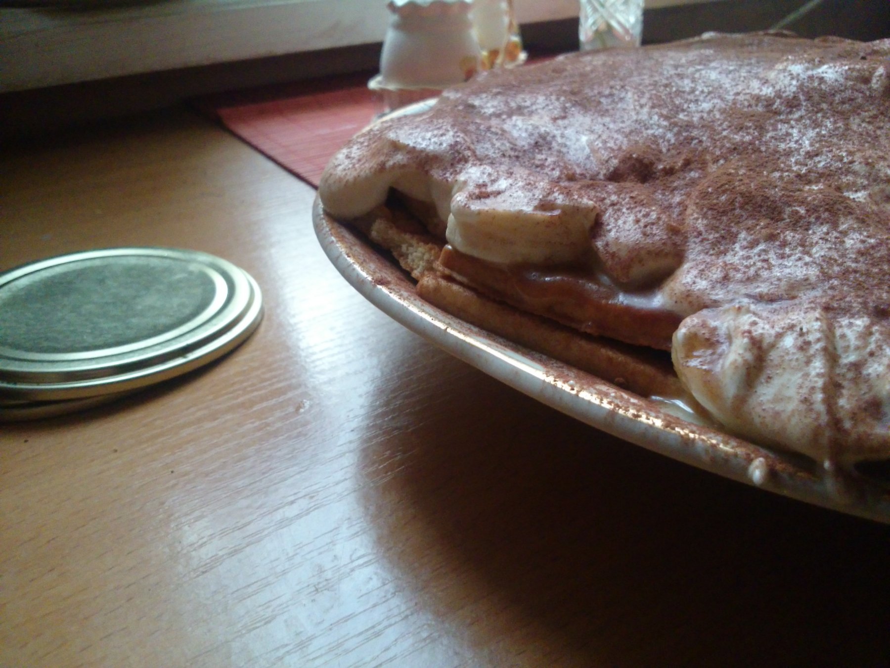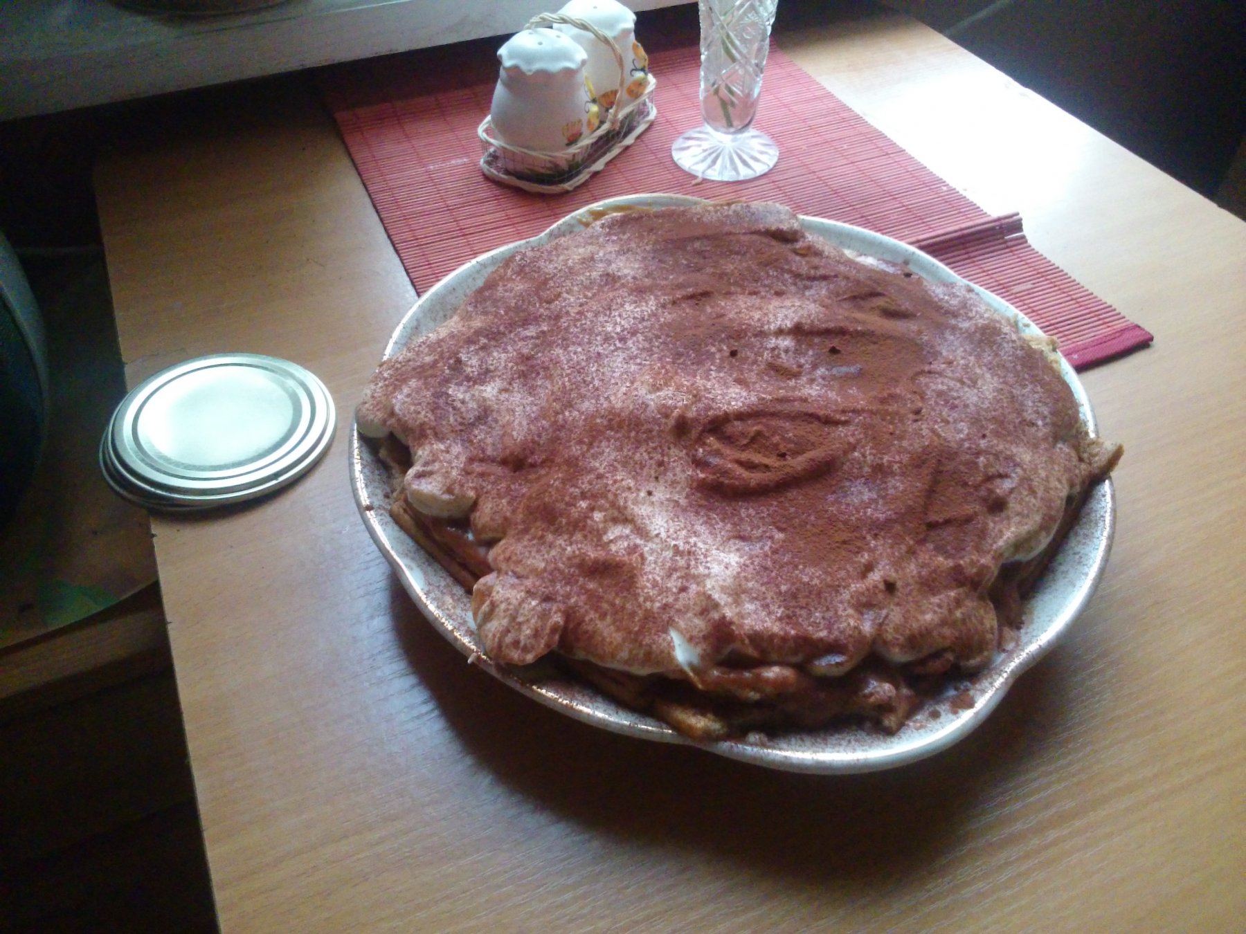 6) KafijaPirmais ir sataisīt piemēram bļodiņā kafiju( ka gatavotu sev dzeršanai, nav jābūt karstai. Pēc tam ņem pa vienam cepumus un iemērc kafijā un tad liekot uz šķīvja kā pamatni kura turēs kūku. Kad tas ir padarīts, ņem iebiezināto pienu un izsmērē pa cepumu virsu. Pēc tam sagriez banānus un pārklāj iebiezināto pienu ar tiem. Pēc tam ņemam saldo krējumu, ielejam traukā kur varētu izmiksēt, pieberam klāt cukuru(nepateikšu precīzi, bet nu pēc izjūtas) un miksējam līdz ir saputojies. Tad pārklājam nu jau banānu kārtu ar saputojoušos saldo krējumu un pa virsu nedaudz pakaisām kakao. Tad lirkam leduskapī uz dažām stundām vai nakti, savilkties.