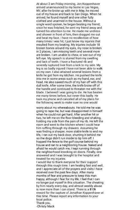 Čalis pamet veceni maijā, tad augustā random uzrodas. Vecene ir ar citu čali. Tas sadod pizdi tam čalim un tad savai ex. Sejas kaulus salauž 18 vietās un degunu 2 vietās. Arī pāris zobi salazuti/izhujārīti. Ar lielu nazi nogrieza viņai matus. Tad gribēja viņu izvarot, bet nevarēja dabūt stindzi. LOL'ed. + viņš viņu visu laiku pats krāpa.