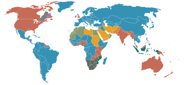 Legal systems of the world. Red is Common Law, and blue is Civil Law. (Tur varbūt neredz tik labi, bet Skotija ir jauktā, ja raksti UK kopā, tad to piemini)